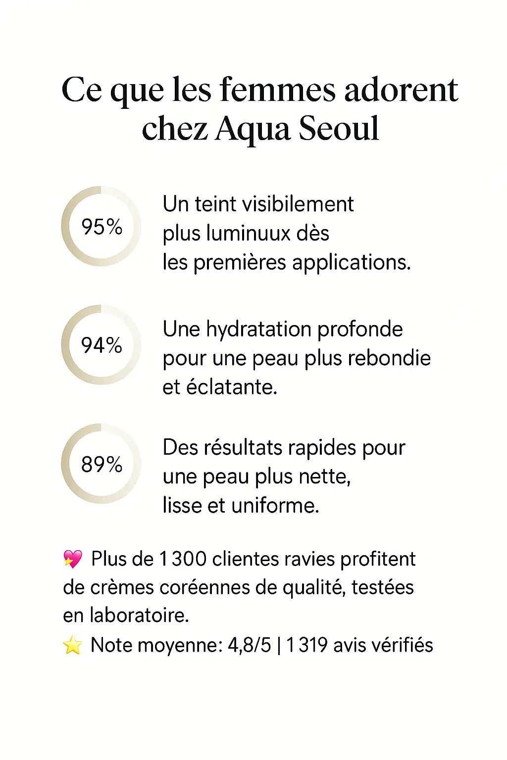 AquaSeoul, c’est la beauté coréenne au service de votre peau. Nos soins sont formulés avec des ingrédients naturels et de qualité, choisis pour leur efficacité prouvée. 90 % des utilisateurs constatent une peau plus lumineuse et hydratée en seulement 2 semaines. Nous nous engageons à offrir des produits adaptés à tous les types de peau, même les plus sensibles, avec une tolérance testée et approuvée par 95 % de nos clients. En plus d’être efficaces, nos produits respectent l’environnement : 85 % de nos emballages sont recyclables et tous nos soins sont sans parabènes ni sulfates. Choisir AquaSeoul, c’est opter pour des soins innovants, respectueux et qui donnent des résultats visibles.